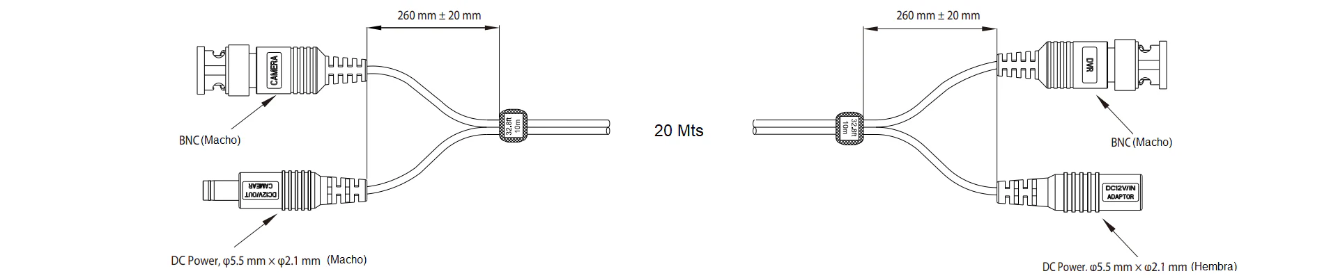 Cable prefabricado con conectores BNC y de alimentación de CC (Ø2,1 mm) listos para usar, que permite conectar directamente la cámara y el equipo de back-end.