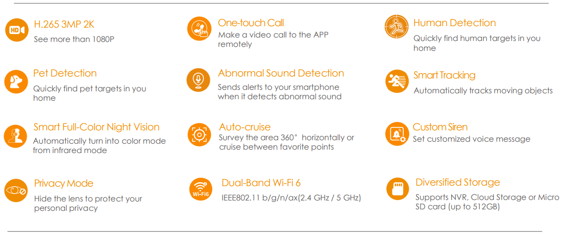 Con monitoreo en vivo de 3MP 2K y funciones de giro de 0~355° e inclinación de -5~80°, el Ranger 2 Pro 3MP garantiza cada rincón de tu vivienda totalmente cubierta. La detección de humanos y mascotas encuentra rápidamente objetivos humanos y de mascotas en imágenes e inmediatamente te envía una notificación. Con el botón táctil, las familias pueden realizar una videollamada a la APP con un solo toque función de llamada. La visión nocturna inteligente a todo color permite que la cámara cambie automáticamente al modo de color y realice un seguimiento inteligente. La función permite que la cámara siga objetos en movimiento cuando detecta movimiento.