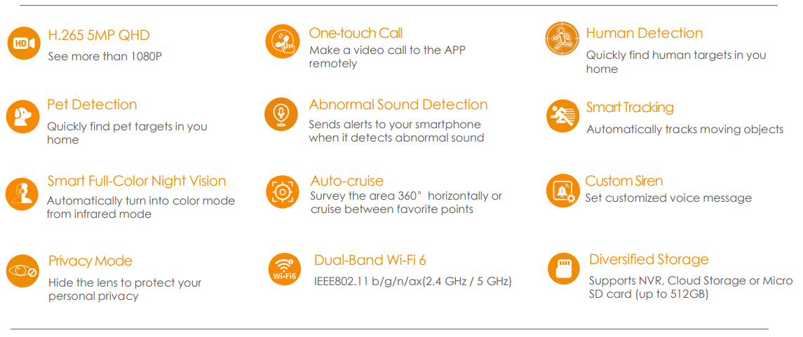 Con monitoreo en vivo QHD de 5MP y funciones de giro de 0~355° e inclinación de -5~80°, el Ranger 2 Pro 5MP garantiza cada rincón de tu vivienda totalmente cubierta. La detección de humanos y mascotas encuentra rápidamente objetivos humanos y de mascotas en imágenes e inmediatamente te envía una notificación. Con el botón táctil, las familias pueden realizar una videollamada a la APP con un solo toque función de llamada. La visión nocturna inteligente a todo color permite que la cámara cambie automáticamente al modo de color y realice un seguimiento inteligente. La función permite que la cámara siga objetos en movimiento cuando detecta movimiento.