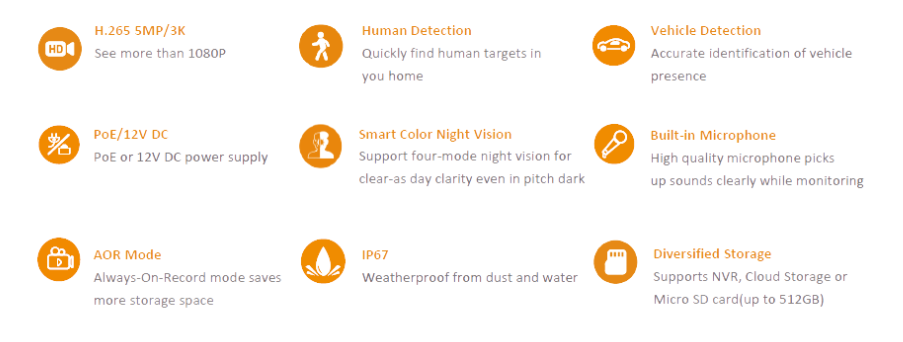 La PS3D ofrece monitoreo en vivo de 5 MP con opción de lente de 2.8mm. Admite cuatro modos de visión nocturna para una claridad impecable incluso en la oscuridad total. Con certificación IP67, la cámara puede usarse en exteriores bajo diferentes condiciones climáticas. Gracias a su foco integrado, mantiene a los visitantes no deseados alejados de sus objetos personales. También es compatible con el algoritmo de desarrollo propio (IMOU SENSE), que aumenta la precisión de la detección de personas y vehículos.