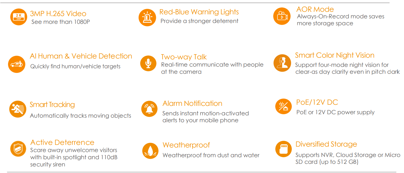 La PS7F cuenta con luz de advertencia roja y azul para una mayor disuasión contra intrusos. Admite cuatro modos de visión nocturna para una claridad impecable incluso en la oscuridad total. Gracias a su resistencia al agua profesional, la cámara puede usarse en exteriores bajo diversas condiciones climáticas.
