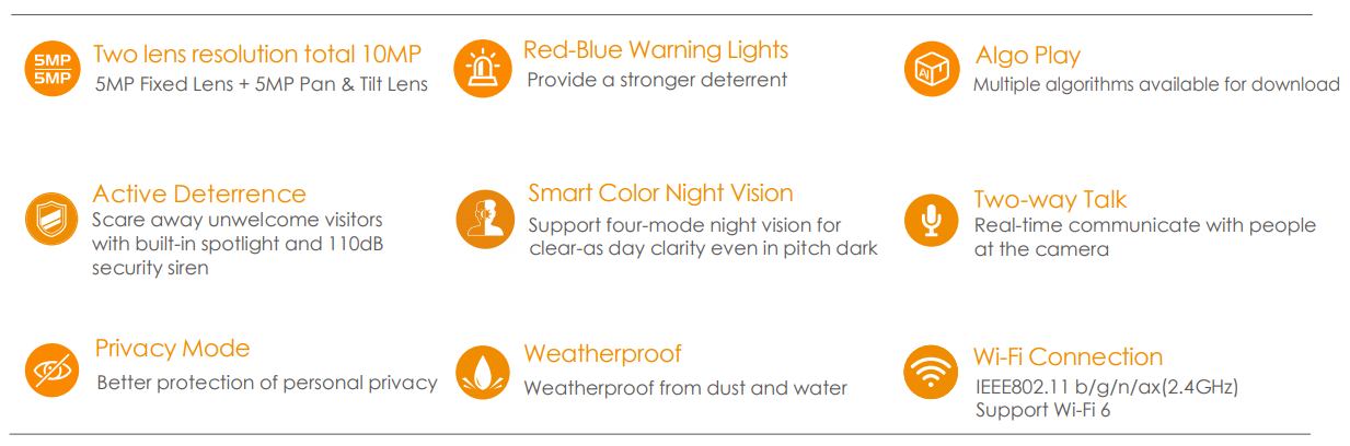 Admite luz de advertencia roja-azul y foco activado por movimiento para una disuasión más fuerte. Con incorporado Foco y sirena de seguridad, Cruiser Dual permite una conversación bidireccional de alta calidad; es compatible con el desarrollo propio de IMOU.