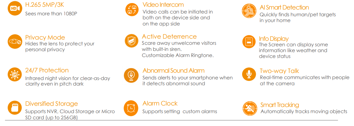 Con monitoreo en vivo de 5MP/3K y función panorámica de giro de 0-355° e inclinación de 0-90°, Rex VT garantiza cada rincón de su hogar, completamente cubierto. Admite videoconferencias bidireccionales con una pantalla de 2,4 pulgadas.