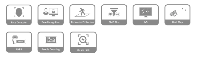 IA por cámara: detección y reconocimiento de rostros, perímetro protección; SMD Plus; conteo de personas; análisis estéreo; mapa de calor