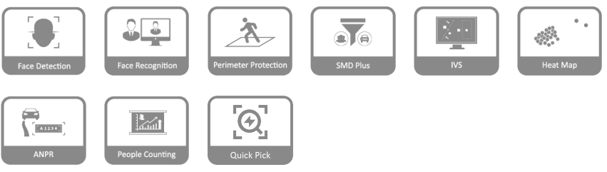 > IA por cámara: Detección y reconocimiento facial, protección perimetral; SMD Plus; conteo de personas; análisis estéreo; mapa de calor.