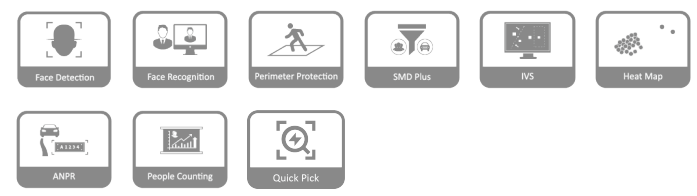 IA por cámara: detección y reconocimiento de rostros, perímetro protección; SMD Plus; conteo de personas; análisis estéreo; mapa de calor.