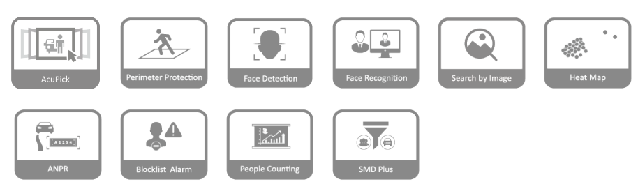 AI by Recorder admite detección y reconocimiento de rostros de 2 canales, hasta 20 bases de datos de rostros y 20.000 imágenes de rostros; 4 canales protección perimetral; SMD Plus de 8 canales.
