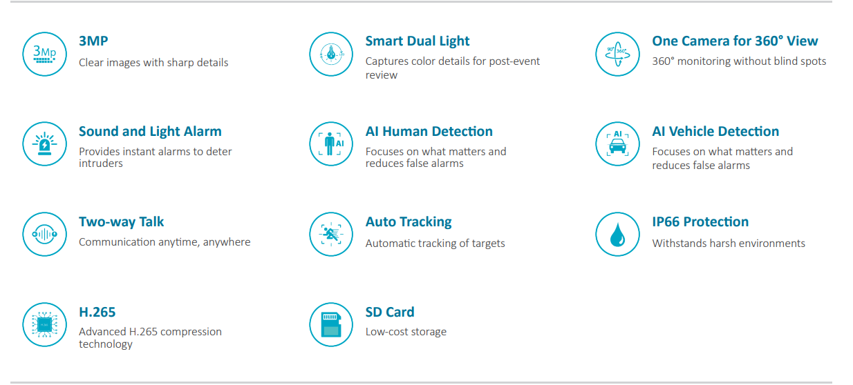 La serie Active Defense de pequeñas cámaras PT eleva el listón del rendimiento. Después de detectar una intrusión, activa alarmas sonoras y luminosas y luego transmite instantáneamente información vital sobre la intrusión al cliente móvil, manteniéndolo informado sin importar dónde se encuentre. Admite conversación bidireccional, lo que le permite comunicarse con personas frente a la cámara en tiempo real. También puede grabar videos a todo color e información de eventos clave utilizando iluminadores duales inteligentes, lo que reduce efectivamente la contaminación lumínica.