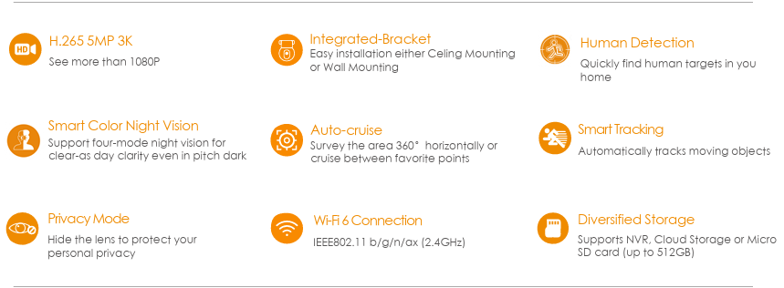 Con monitoreo en vivo de 5MP/3K y funciones de giro de 0~355° e inclinación de -5~50°, el Ranger Mini 5MP garantiza que cada rincón de su hogar esté completamente cubierto. El diseño de soporte integrado permite una fácil instalación, ya sea en el techo o en la pared. La Detección Humana encuentra rápidamente objetivos humanos en imágenes y le envía inmediatamente una notificación. El modo de privacidad ayuda a proteger su privacidad personal cuando está en casa y la función de seguimiento inteligente permite que la cámara siga objetos en movimiento cuando detecta movimiento.
